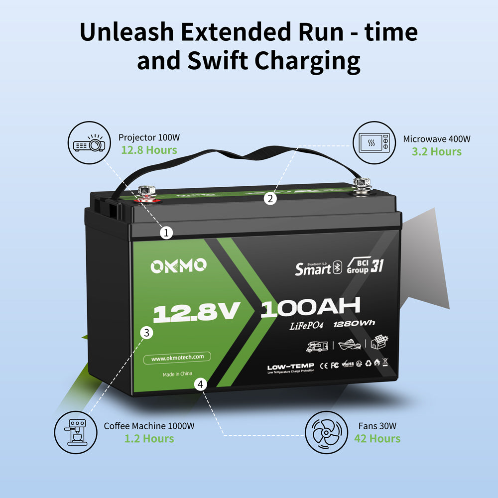 🔥 Eco-Friendly Materials & Design : Constructed using non-toxic, environmentally friendly materials, the OKMO 12V 100Ah battery is a safe and sustainable energy solution for users seeking eco-conscious alternatives in power storage.