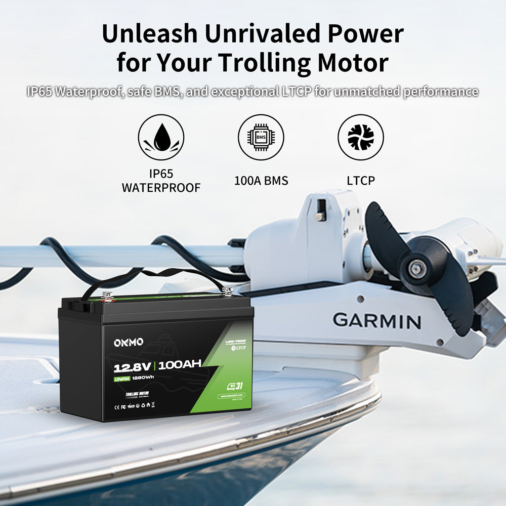【Triple Extra Protection BMS and Low-Temperature Cutoff】: The OKMO 12V 100Ah battery is optimized for trolling motor users, featuring a BMS with triple protection against dust, water, and salt spray. Additionally, it has an upgraded low-temperature cutoff feature to ensure safe usage in cold environments.