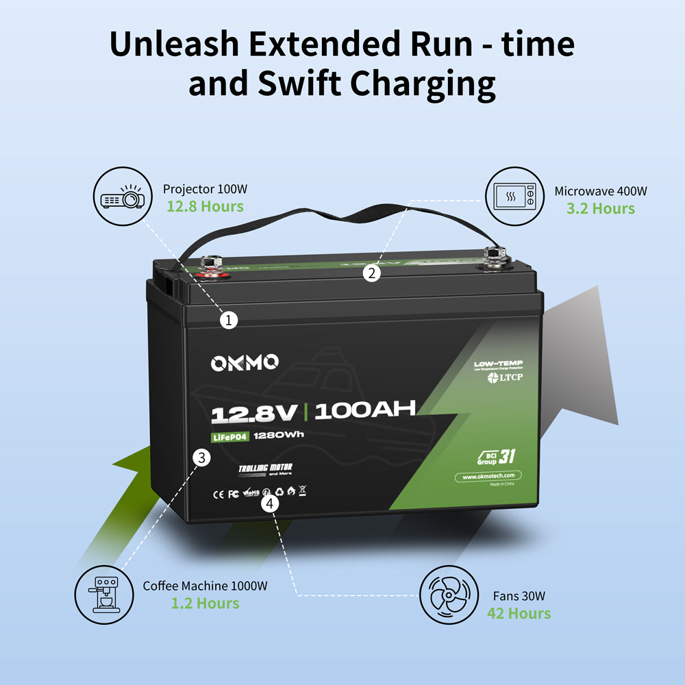 🔥 Designed for Kayaka & Trolling Motor Battery:OKMO 12.8V 100Ah 1280Wh LifePo Class A cell supports charging of devices such kayak trolling motor,provides 1.5 -2.5 hours of continuous operation for kayak trolling motor.