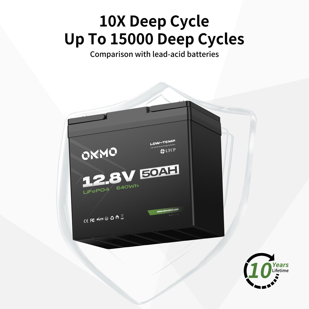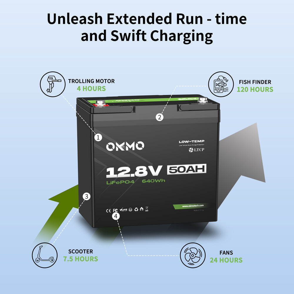 🔥 Designed for Trolling Motor Battery:OKMO 12.8V 50Ah 640Wh LifePo Class A cell supports charging of small devices such kayak trolling motor,provides 1.5 -2.5 hours of continuous operation for kayak trolling motor.